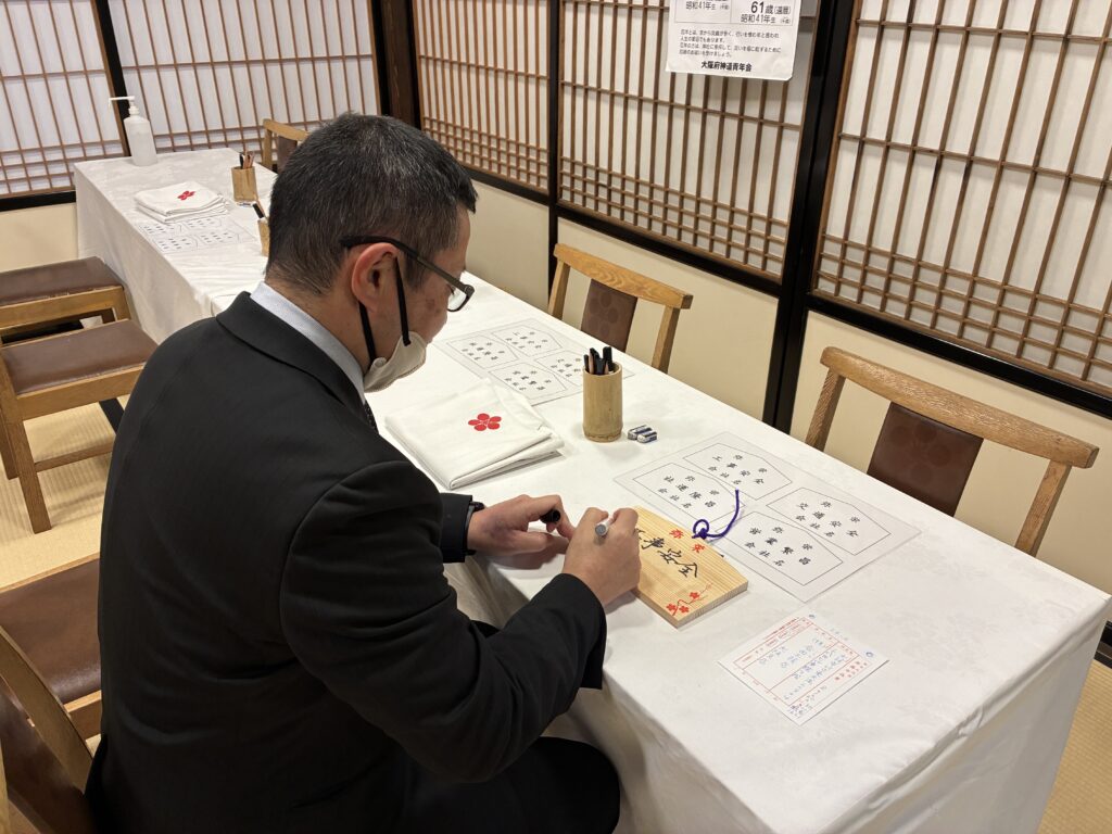 ご祈祷を受ける前に、待合にて絵馬を書きました。絵馬には、今年1年間の無事故・無災害を願って、「工事安全」としたためました。